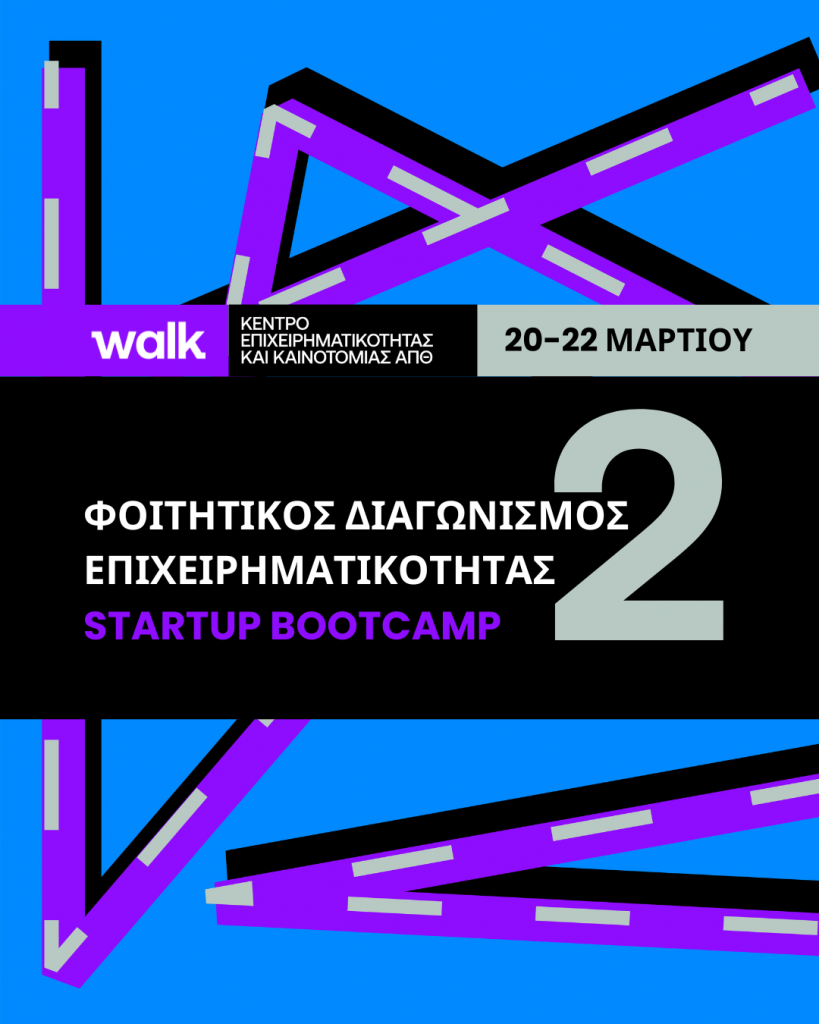 Το Αριστοτέλειο Πανεπιστήμιο Θεσσαλονίκης (ΑΠΘ) σας προσκαλεί στον 2o Φοιτητικό Διαγωνισμό Επιχειρηματικότητας (Startup Bootcamp), ο οποίος θα πραγματοποιηθεί στις 20-22 Μαρτίου 2026, από το WALK AUTh Innovation Accelerator, Κέντρο Επιχειρηματικότητας και Καινοτομίας του ΑΠΘ στο ισόγειο του ΚΕΔΕΑ.