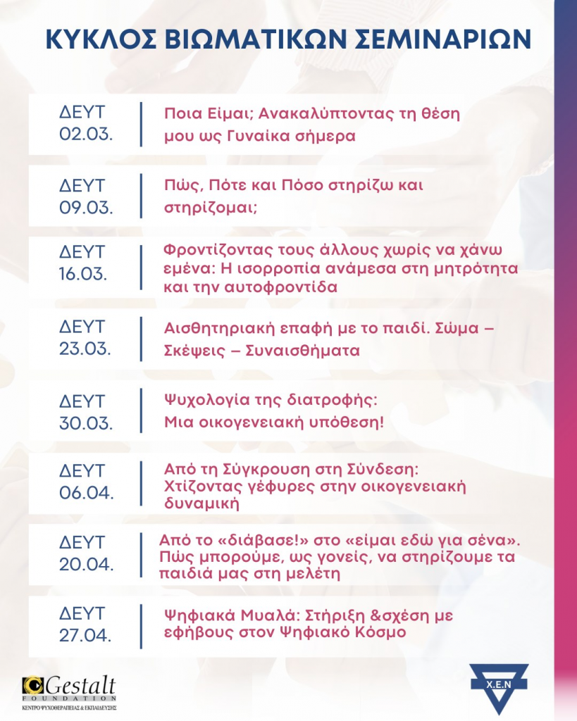 Η Χ.Ε.Ν. Θεσσαλονίκης, σε συνεργασία με το Gestalt Foundation, διοργανώνει έναν κύκλο δωρεάν, αυτοτελών σεμιναρίων, με στόχο τη συνάντηση, το μοίρασμα και την ανάδειξη διαφορετικών οπτικών. Τα σεμινάρια είναι βιωματικά και θεωρητικά.