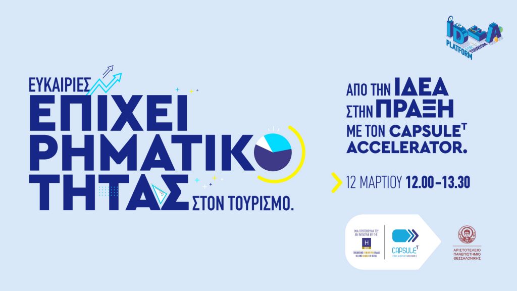 Με μεγάλη επιτυχία πραγματοποιήθηκε η ειδική διαδικτυακή εκδήλωση σε συνεργασία με τον επιταχυντή νεοφυών επιχειρήσεων (startups) στον Τουρισμό, CapsuleT Travel & Hospitality Accelerator, πρωτοβουλία του Ξενοδοχειακού Επιμελητηρίου Ελλάδος, σε συνεργασία με το Γραφείο Διασύνδεσης ΑΠΘ, την Πέμπτη, 12 Μαρτίου στις 12:00μμ.