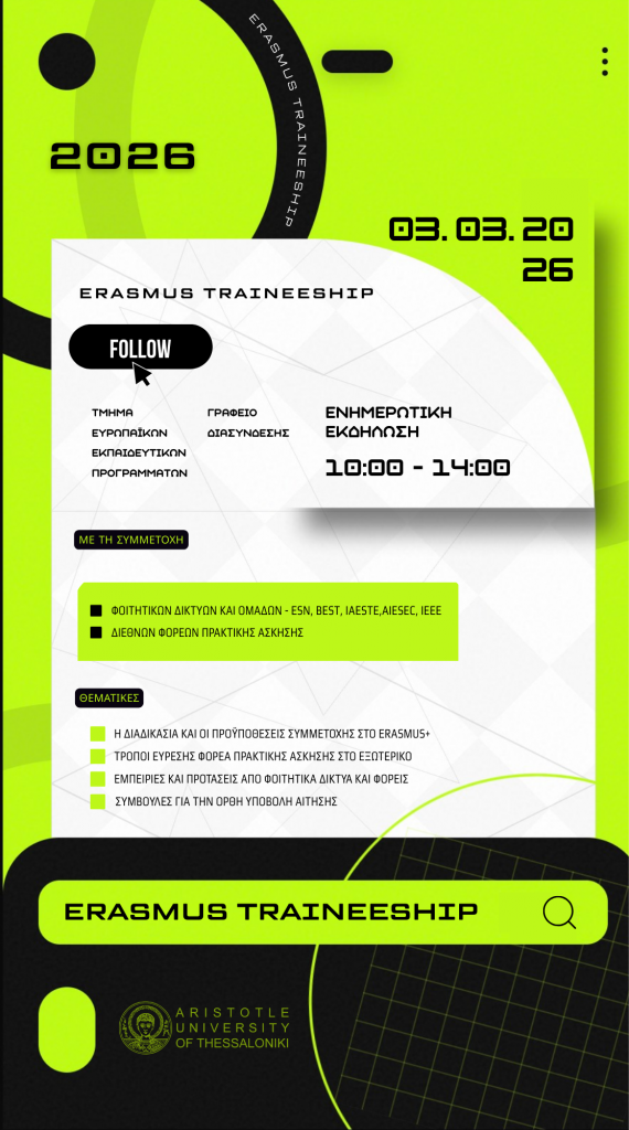 To Τμήμα Ευρωπαϊκών Εκπαιδευτικών Προγραμμάτων ΑΠΘ και το Γραφείο Διασύνδεσης ΑΠΘ της Διεύθυνσης Συντονισμού Ακαδημαϊκών Μονάδων, συνδιοργανώνουν την Τρίτη 3 Μαρτίου 2026 στο Αμφιθέατρο ΙΙ του Κτιρίου ΚΕΔΕΑ ΑΠΘ, εκδήλωση σχετικά με την υποβολή αιτήσεων για τη δράση Erasmus+ Πρακτική Άσκηση και την αναζήτηση φορέα πρακτικής άσκησης στο εξωτερικό.