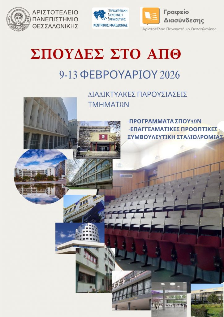 Διαδικτυακή Ενημερωτική Εκδήλωση Επαγγελματικού Προσανατολισμού για τις μαθητές/τριες και τους μαθητές Β΄ και Γ΄ τάξης όλων των τύπων Λυκείων της Περιφέρειας Κεντρικής Μακεδονίας, σε συνεργασία με την Περιφερειακή Διεύθυνση Πρωτοβάθμιας και Δευτεροβάθμιας Εκπαίδευσης Κεντρικής Μακεδονίας, με σκοπό την έγκαιρη και αξιόπιστη ενημέρωση τους, σε σχέση με τις δυνατότητες και προοπτικές σπουδών ανώτατης εκπαίδευσης στο Αριστοτέλειο Πανεπιστήμιο Θεσσαλονίκης.