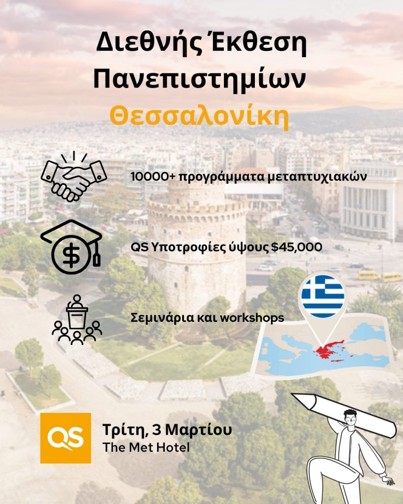 Η μεγαλύτερη διεθνής έκθεση πανεπιστημίων αποκλειστικά για μεταπτυχιακά και διδακτορικά προγράμματα της QS επιστρέφει στην Θεσσαλονίκη, 3 Μαρτίου.