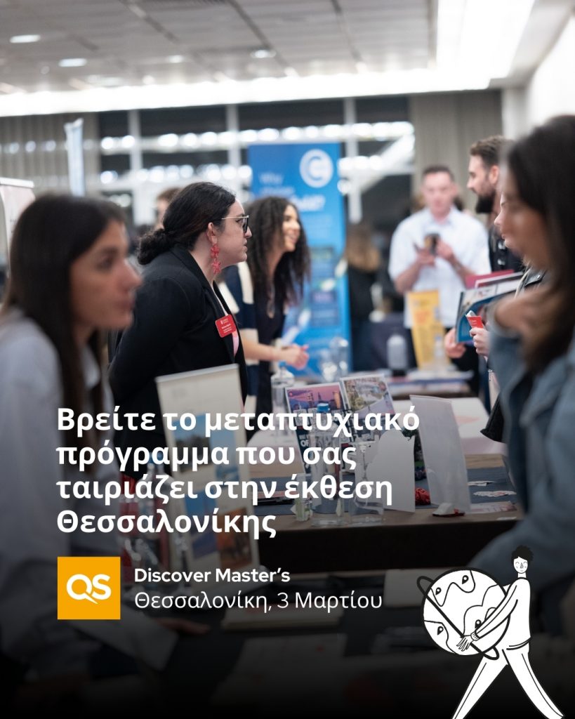 Η μεγαλύτερη διεθνής έκθεση πανεπιστημίων αποκλειστικά για μεταπτυχιακά και διδακτορικά προγράμματα της QS επιστρέφει στην Θεσσαλονίκη, 3 Μαρτίου.