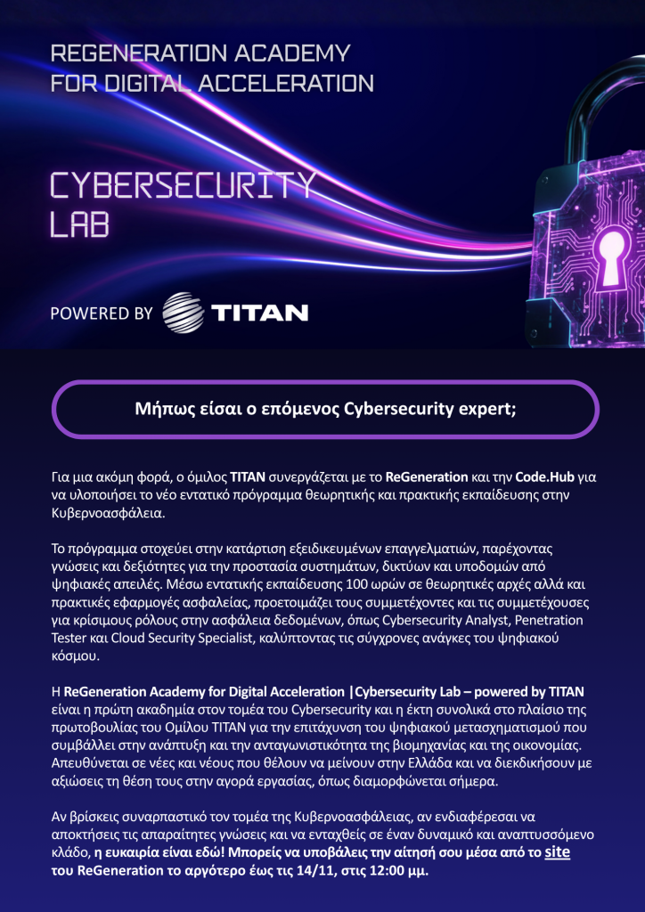 Ο όμιλος ΤΙΤΑΝ, σε συνεργασία με το ReGeneration και την Code.Hub, υλοποιεί ένα νέο εντατικό πρόγραμμα 100 διδακτικών ωρών, θεωρητικής και πρακτικής εκπαίδευσης στην Κυβερνοασφάλεια.