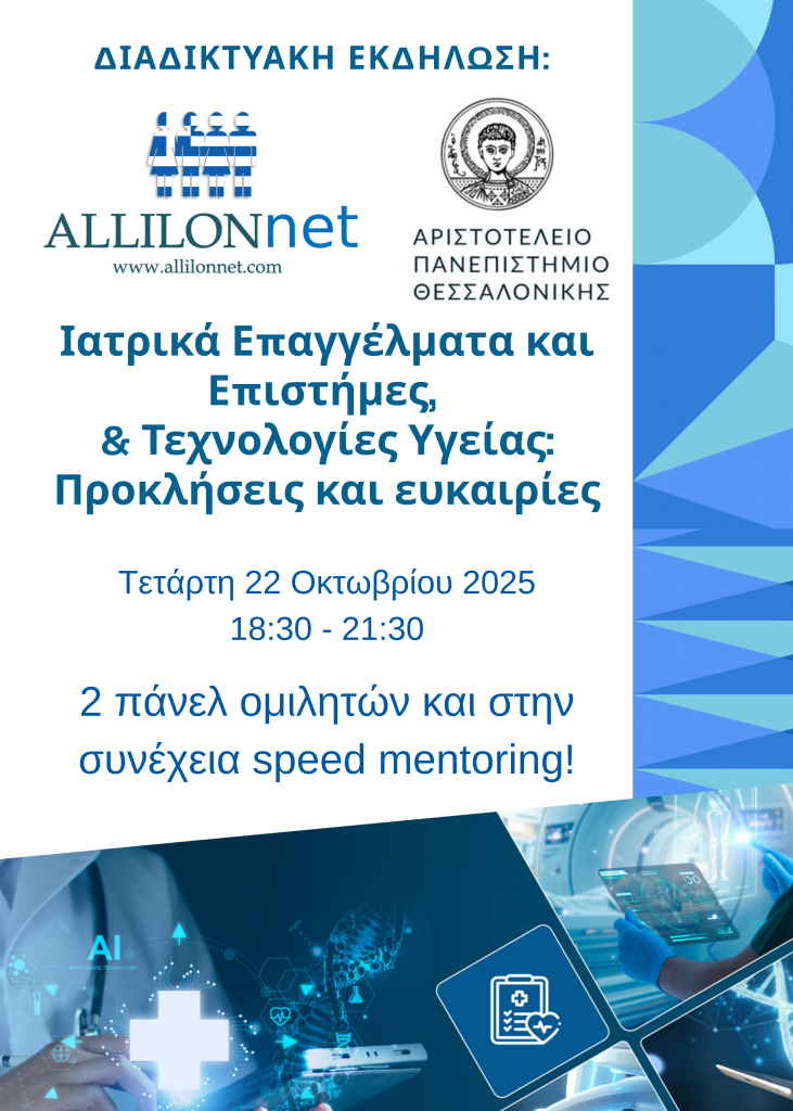 Σας προσκαλούμε να ενημερωθείτε για την επερχόμενη διαδικτυακή εκδήλωση που διοργανώνει η ΆΛΛΗΛΟΝ σε συνεργασία με το ΑΠΘ και το Διεθνές Πανεπιστήμιο Ελλάδος. Το θέμα της εκδήλωσης είναι: «Ιατρικά Επαγγέλματα και Επιστήμες και Τεχνολογίες Υγείας: Προκλήσεις και ευκαιρίες», και θα πραγματοποιηθεί την Τετάρτη 22 Οκτωβρίου 2025 (ώρα Ελλάδας 18:30 με 21:30).